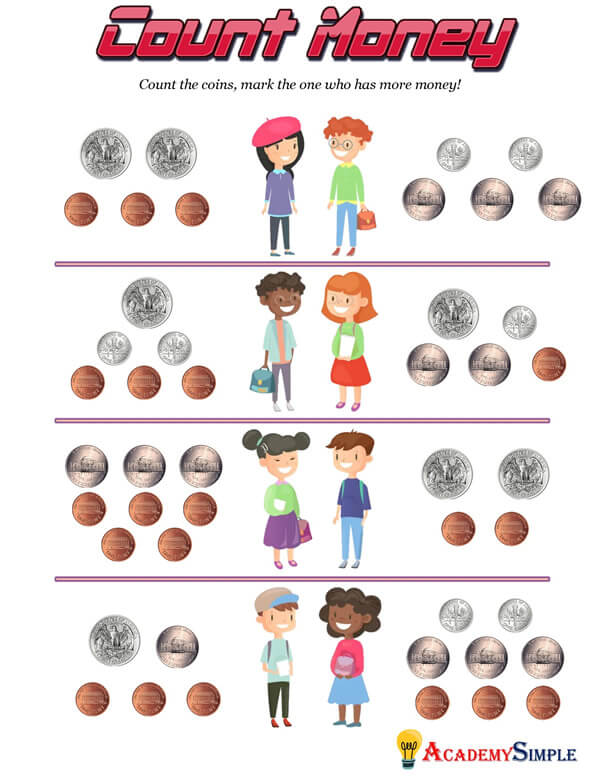 Students should know skip-counting by 5s and 10s before they start counting money. It will be wise to introduce two kinds of coins at the first stage. Using real coins will be a great help for kids to have better comprehension. After they get enough practice you can introduce other coins and use mixed groups to continue practicing. Papers are easier to learn for kids as they are not confusing like coins.