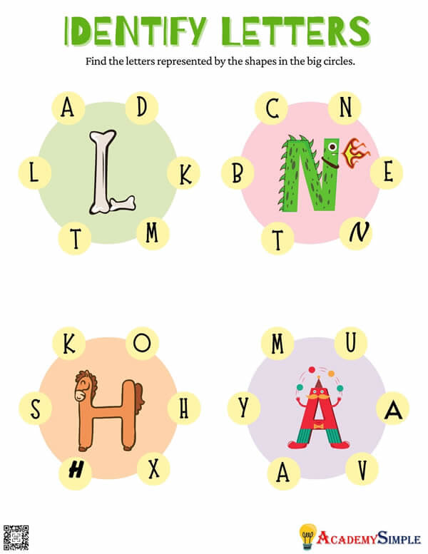 This letter identification worksheet will help children recognize the letters formed with different shapes and in different fonts.