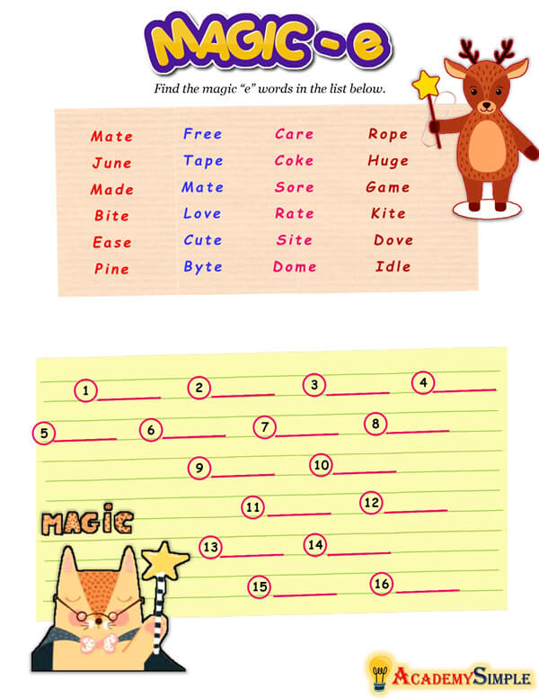 When the vowel “e” comes to the end of the word, the preceding vowel says its name or long sound, and this “e” becomes silent. Then, we call this “e” as magical or silent “e”. It is magical because it changes the sound and meaning of a word just by touching it! The magic e vowels are as follows: a_e, i_e, o_e and u_e.