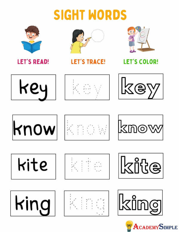 Reading Tracing and Coloring Sight Words – Sight Words with the Letter K