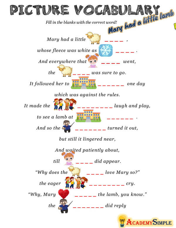 Picture Vocabulary – Mary Had a Little Lamb